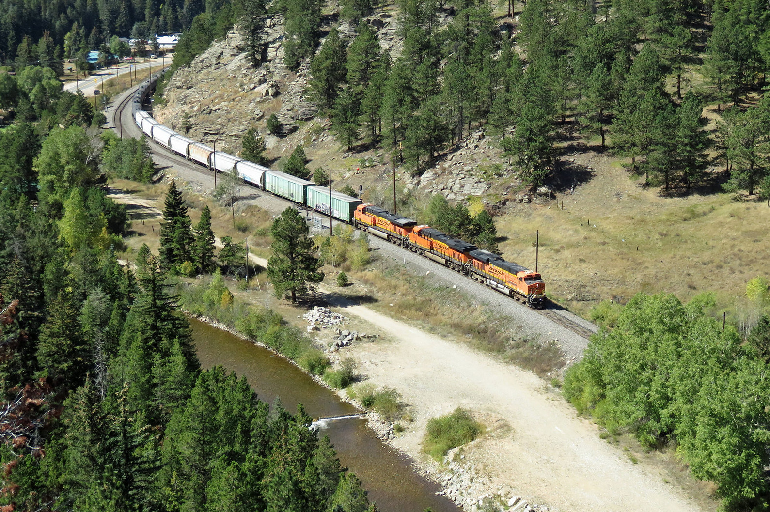 At Crescent, the rolling terrain that began to emerge after Tunnel 17 opens into a wide valley in South Boulder Canyon. In fact, below Crescent lies Gross Point Reservoir. Crescent Siding is only 5550 feet long, and is the shortest siding in the Tunnel District. However, it is halfway between Plain and Cliff sidings and provides an important point for shorter trains to pass and for crew access or helper engines to make it back down the mountain without interfering with traffic.